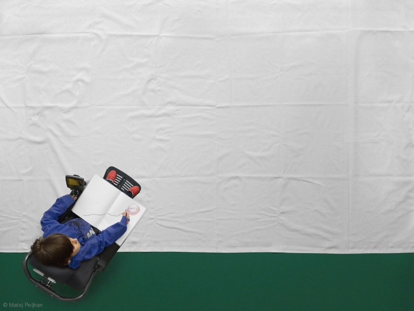 The only thing he is physically capable of are tiny, yet extremely weak movements with his fingers. They help him manage the joystick of his electrical wheelchair, as well as hold a flomaster which enables him to slowly but persistently and accurately create drawings on small pieces of paper; drawings that overflow with his ideas and his imagination.