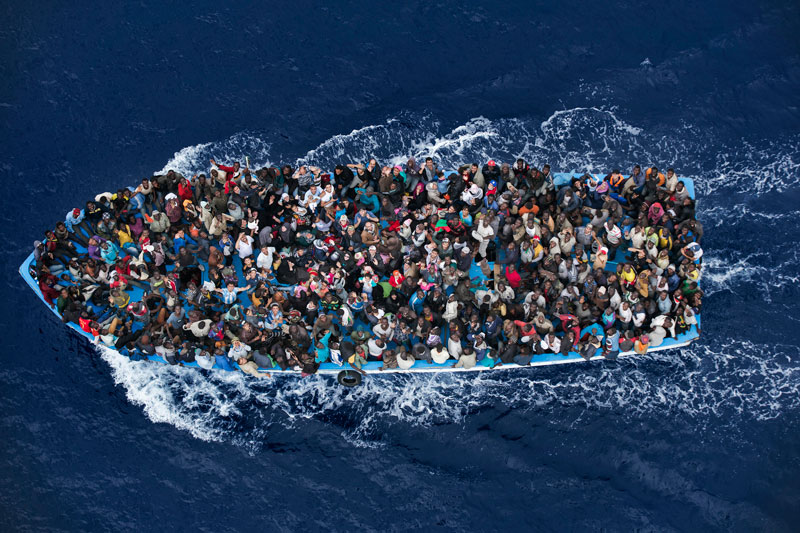 Shipwrecked people are rescued aboard a boat 20 miles north of Libya by a frigate of the Italian navy. After hundreds of men, women and children had drowned in 2013 off the coast of Sicily and Malta, the Italian government put its navy to work under a campaign called “Mare Nostrum” rescuing refugees at sea. Only in 2014, 170,081 people were rescued and taken to Italy.