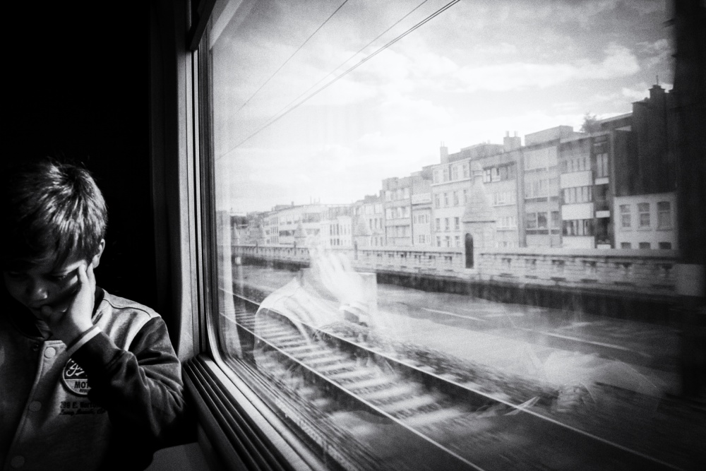 Like Hans Knikman, Bruno Floor shows us the more contemplative side of life. Here we see Bruno's son lost in thoughts while the train is leaving Antwerp (Belgium). As if to emphasize the mood, the boy is placed in darkness, with just a bit of sun on his face and isolated from the bright city outside. Hans Knikman emphasised his pensive man by placing him in the light, Bruno chooses the opposite lighting for emphasis, but both are focusing on the mood of the moment. In both cases, it is the light-dark contrast, which characterizes the photo.