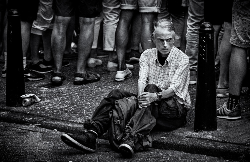 While the surrounding people at this public gathering seem to bestretching their necks in order to miss nothing of what is going on in front of them, this man sat down. Tired and seemingly lost in thoughts, or overwhelmed by emotions perhaps. The scene reminded me of Henri Cartier-Bresson who in a report on the coronation of King George VI had more interest in the crowds than in the pomp and circumstance. It is the same here. Hans Knikman is interested more this man with his expressive eyes, sitting on the sidewalk, than in the things that happen in front of the crowd. It is also a portrait of an individual, who created his own space in the midst of an anonymous crowd. It is as if the photographer wants us to show, that any mass gathering consists of individuals, just like this man here on the sidewalk.