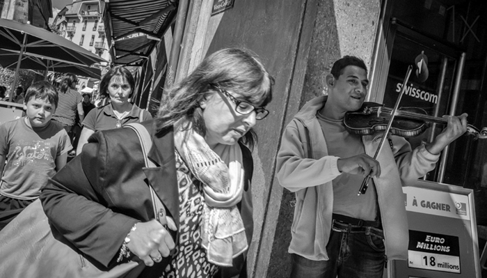 On the internet I read a very nice definition of street photography. It said, amongst other things, that a street photo should constitute a moment of synchrony between unrelated elements. And that's exactly what I'm experiencing in Speedy's photograph. The violin player is the main protagonist in this photo. He is playing his tunes, unnoticed by the passing lady, who is deeply emerged in her thoughts. Behind her a mother and her son, also living in a world of their own, staring at the photographer. It seems that for them the musician is non- existent and so it is meaningful coincidence, that he is pictured while standing in the shadow. Likewise meaningful is the advertisement in the corner - 18 million euros to win. The dream of prosperity for people who may be poor.