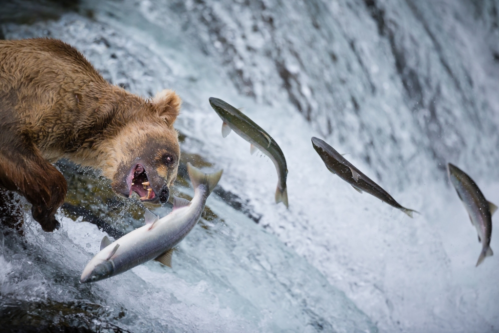I tried many different camera settings once I arrived at the Falls. Soon I realized that 1/1600 second shutter speed was the lower safety limit, and 1/2000 second was the “no risk” shutter speed. Unfortunately, the light was not always optimal; this part of the world is often very cloudy. I know that the latest cameras allow high ISO sensitivity with little noise, but again, that is not my way to practice. So sometimes I take some risks and try to limit the ISO as much as I can. I was not expecting these four salmon to jump at the same time. If I had, I would have increased the ISO even higher than 2500 to ensure I got the shot. Thankfully, though, I didn't miss it; it was perfectly sharp, even with a shutter speed as low as 1/640 second. For this photo I also corrected the exposure to +1â…“ stops since the bright waterfall covered more than two-thirds of the image. The challenge in a case like that is to overexpose enough to have the bear properly exposed while making sure the water is not blown out.I very quickly realized another difficulty once I arrived on the platform. If the salmon were jumping on the left side of the bear, then the bear’s face was turned in the other direction and I could only see the back of its head. It was a pity that about two-thirds of the jumps were on the “bad” side. So a second complication, after realizing that there would be fewer salmon while I was there, was that I had to wait for the salmon to jump between the platform and the bear so I could get a good photo of him looking my way.