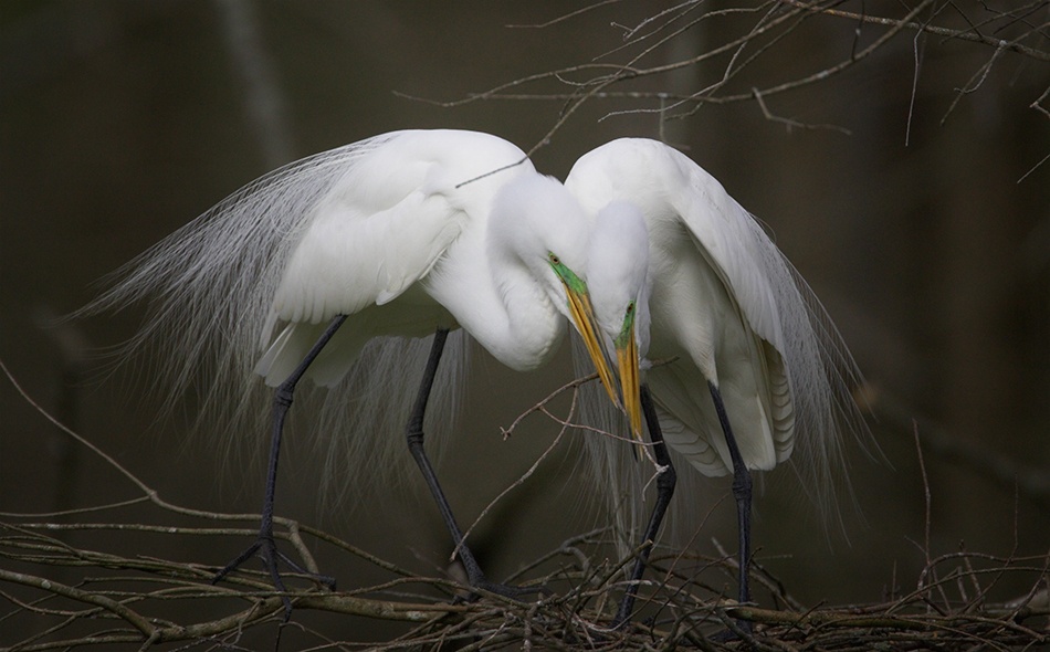 This photo was shot on Lake Martin, Louisiana, USA. The birds are Great Egrets (Ardea alba). While the overall purpose of the trip was to photograph a colony of Roseate Spoonbills in the area, I saw an opportunity to work on nesting egrets. The birds were starting their mating ritual, and they were in full breeding plumage, going through courtship behavior.