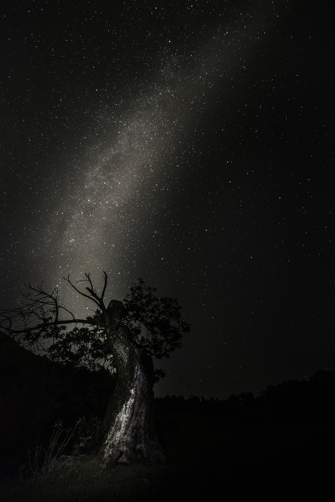 It took over an hour to understand how to light up the tree for it to be nicely visible in the final photo. This is a 30-sec exposure with about 3-sec flashing light on the tree (I used my cell phone torch).