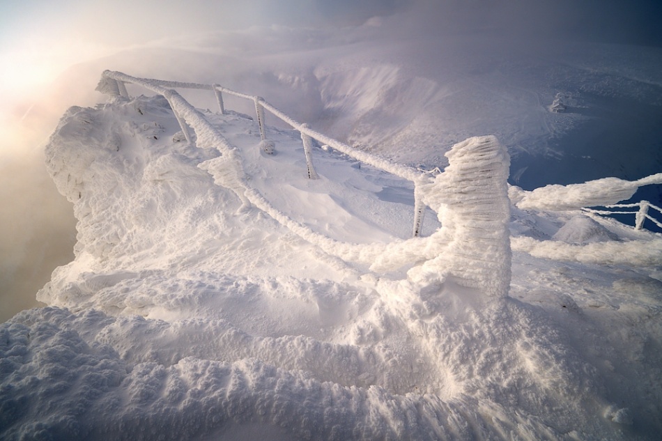 Every winter I make two or three trips to the higher parts of these mountains. Each time I visit, the same places look so different. There's either much more or much less snow, sun or clouds, fog and/or frost, and all of those factors create unusual scenes, making every moment unique. This photo was taken in December when the weather was perfect, meaning it was 5°F (–15°C), there was a lot of snow, strong winds, soft mist and low clouds.