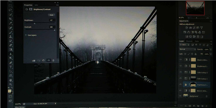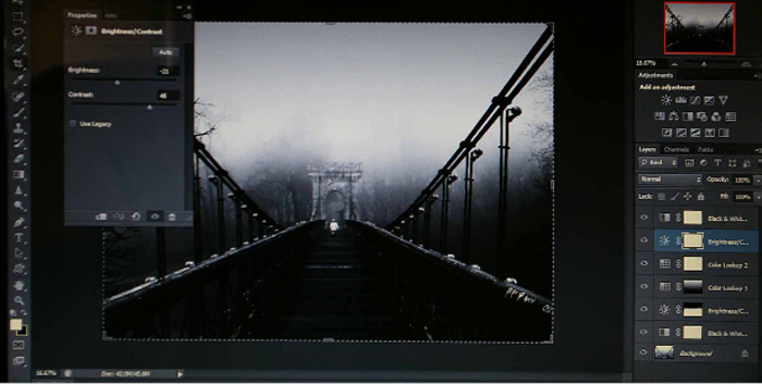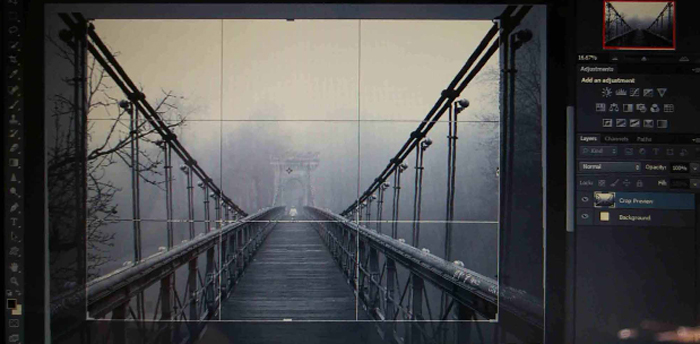 First I opened Adjustments and made the image Black&White to give a more dramatic mood, which is very important in this type of images involving fog. Afterwards I go to the left hand side column and I choose Crop Tool to straighten the horizon and crop 4x5(8x10).