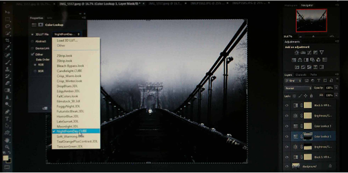 Next step was to reduce light from the sky: I use the Lasso Tool again and made another layer for sky only I go to Adjustments/Color Lookup/NightfromDay and made the sky a bit darker.