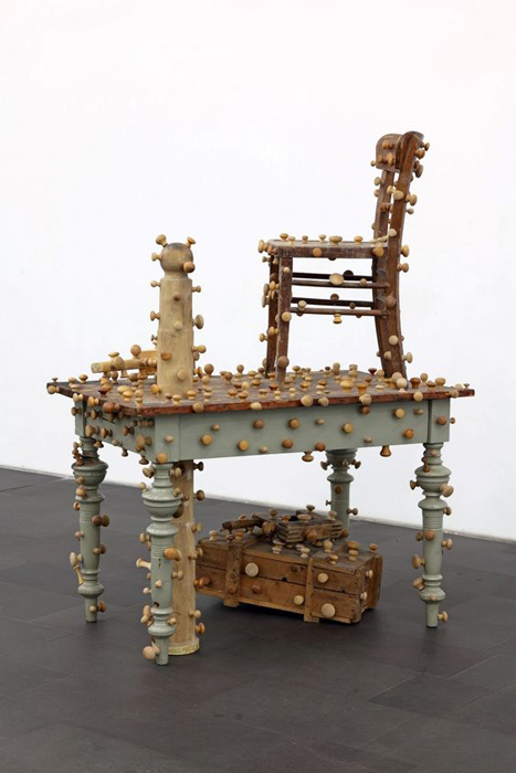 I would also quote the English sculptor Tony Cragg’s artwork for his work on the objects and the way he gives them a sculptural dimension by scales and materials changes or in assembling them to create new forms.