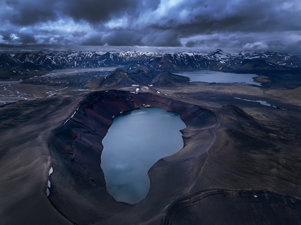 In landscapes, the story is often about the mood or emotive content of the scene. The pendulous clouds in this image hang oppressively over the expansive vista. The eye is led into the image by the walls of the crater lake in the foreground and the overall tone of the image is sombre with muted colours.
