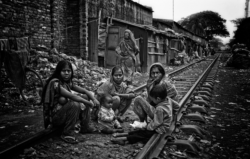 This family with young children living in a slum setting on a railway line needs little further comment. The image is strengthened by reducing to line, shape and texture with a black and white conversion with the family dominant in the centre of the scene.
