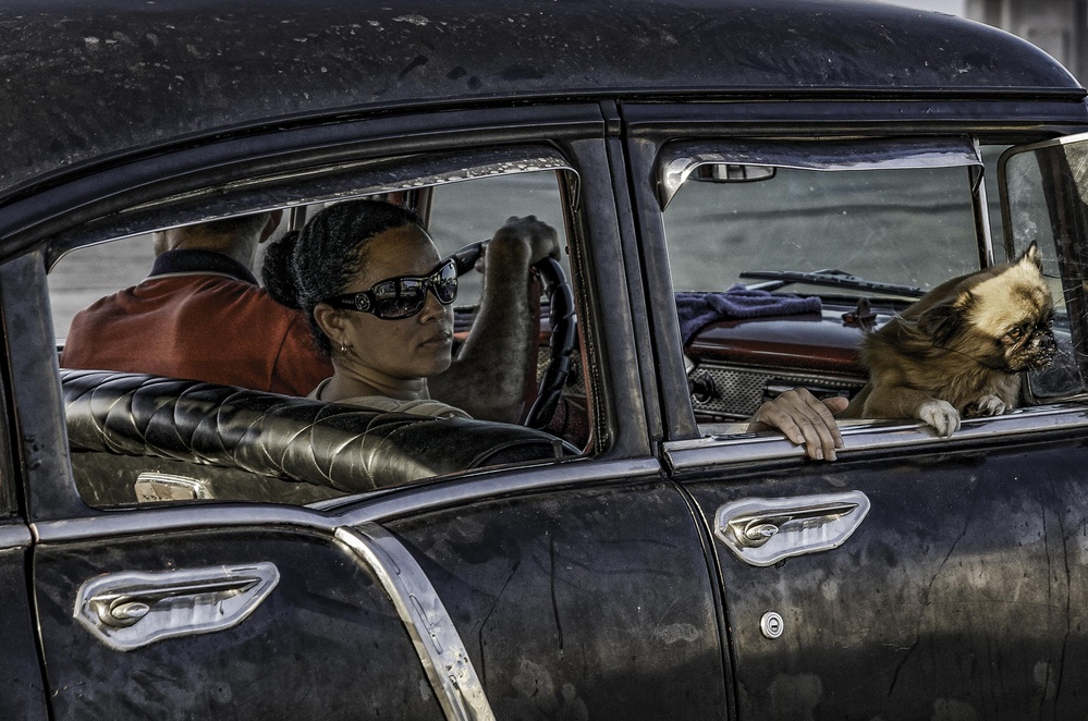 To take a different kind of image, we see what appears to be a reasonably well-to-do lady with designer sunglasses and designer dog with a man in the front seat who looks more like a taxi driver than a friend or husband. The car looks old and dirty so there are a number of contradictions about this image. But the title makes it clearer: Malecon is the main coastal road in Havana, so the cars are going to be old and that dirt is probably sand.