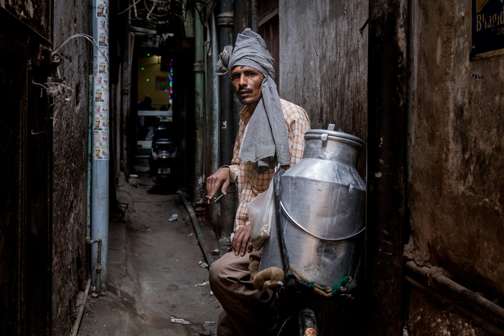 The morning worker delivering milk in a poor business district in what the title tells us is ‘Old Delhi’ conveys the sense of everyday life in that location. In this case, the photographer has allowed him/herself to be noticed and there’s a certain element of hostility in the face of the man which changes the story. As a photographer, one should always be aware of the effect of one’s presence on the image: in fact, there are two persons in this picture.