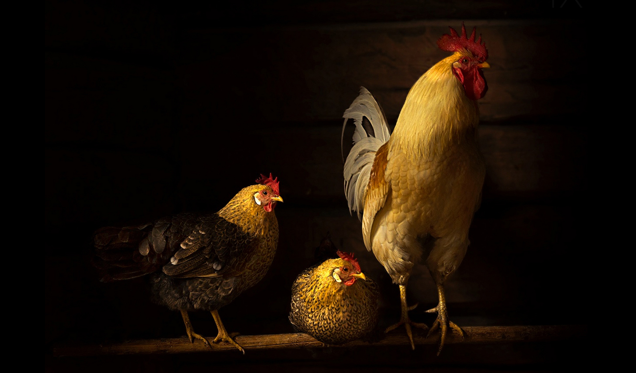 I zoomed in to fit the chickens in the frame and get rid of disturbing elements such as the window and a lamp hanging from the ceiling. By the time I had taken four photos, the chickens were all over the place. I reviewed the photos on the camera screen, and this one already looked like a painting. This was probably due to the texture of the feathers of the rooster, combined with some slight blurring from the slow shutter speed I had used. This photo was sharper than the others since the chickens were sitting still at that point. I knew I could enhance this painterly look even more with post-processing. This is a photo with some very nice colors and birds that knew how to pose for the camera. I am very pleased with the final result, and only wish I had been able to use a faster shutter speed to get even more detail in the feathers.