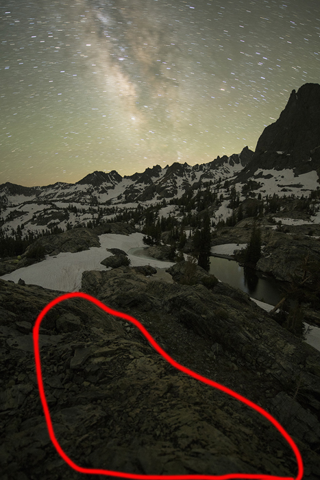 Similarly to the case of Minaret Lake photography, when I took photos of the foreground, I titled my camera down a bit in order to cover a larger part of the lower foreground.