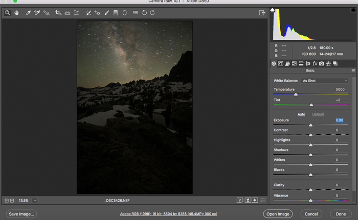 (a) Long exposure for Minaret Lake: 180 seconds with camera long exposure noise reduction on.
