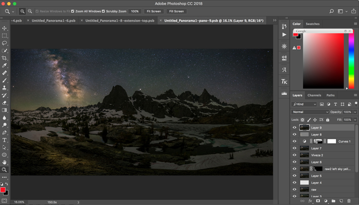 I shot 9 frames from right to left, covered about 150 degrees of view. I made sure that the each shot covered sufficient lower part of the foreground, as well as had about 40% overlap with the previous shot. This process took one hour to complete – each shot took 3 minutes exposure plus 3 minutes noise reduction, altogether 6 X 9 = 54 minutes.