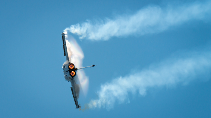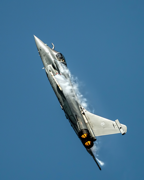 In this example, my post processing increases the amount of detail captured, not just in the plane itself but in the wig-tip smoke. Some local burning of shadow areas add a little more directional lighting from the left and, as I didn’t have the luxury of a blue sky, application of a split blue-yellow colour temperature grad top and bottom. I still would have liked a little more visibility of the cockpit, but I’m happy for now.