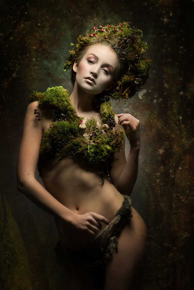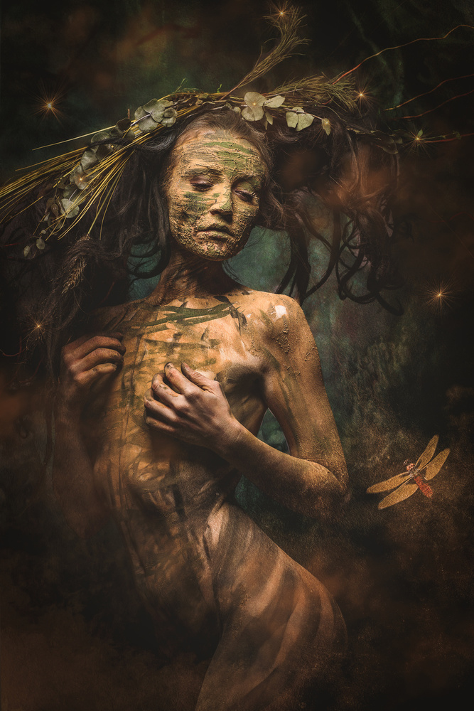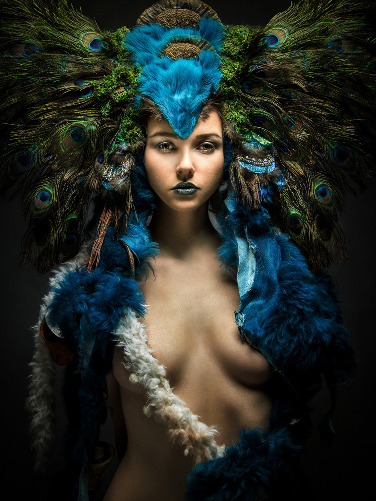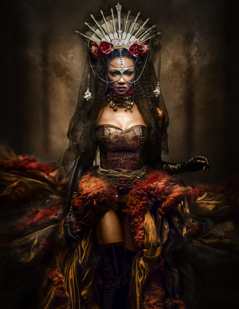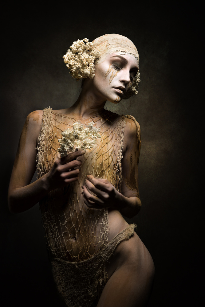 I start of with a careful skin “treatment”. This gives me the possibility of a slow approach, of getting to know the heart of the picture. After that I look for a background, a texture, or sometimes even 10 overlaying textures, depending on the creative idea or process. I'm looking for Flaires, Patterns, Overlays and Bokeh’s. I have a huge library of them. This can easily take hours. When everything is done, I give the whole picture a colour look, that fits, so all the parts harmoniously join in one arrangement.