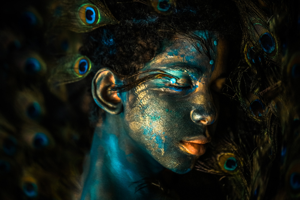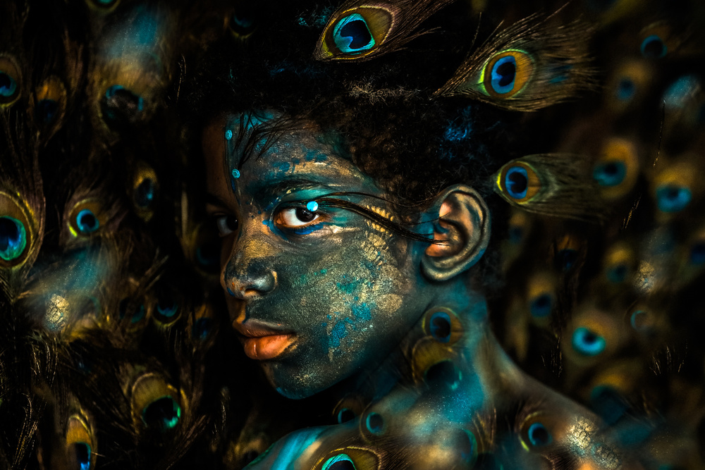 The preparations for the series “the peacock” were intense. Since I do not photomontage, I always have to think in advance exactly how the image has to look according to what I already have in mind. The textures and artistic make-up all are made by myself. Looking closely at the bird, I start spontaneously to paint it on the face of my model with my own brushstroke.
