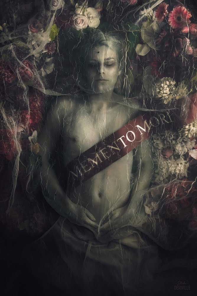 “Memento Mori” is a portrait taken from a triptych inspired by vanities. I realized this project in November 2019 in collaboration with Aubane, a model with whom I work regularly and who shares my passion for dark and strange subjects. I wanted to represent the beauty of the cycle of life and its effects on our body through three stages and three Latin expressions: life, death at work and death accomplished. This photo represents an aspect of life that we often avoid approaching, that disgusts and that we try to forget. Despite the visible effects of death, the young dead woman seems peaceful; stretched out under a cracked shroud, her faded skin bears cadaveric hues close to those of the flowers that surround her. The fly placed on the veil announces the transformations to come which will lead to the next stage. This triptych was exhibited in Brussels in February 2020, when we began to talk about the Covid-19 epidemic. I now have it as a reminder: you have to enjoy life without forgetting that one day it stops.