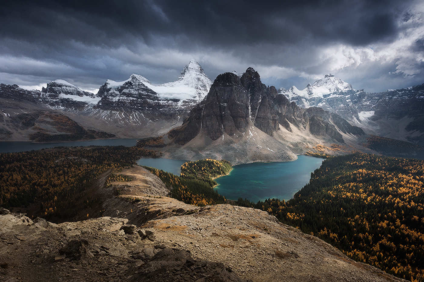 At 3’618 metres, Mount Assiniboine, located on the British Columbia/Alberta border is the highest peak in the southern part of the Canadian Rockies. Because of its pyramid-like shape, this dominant mountain is nicknamed the Matterhorn of North America.
