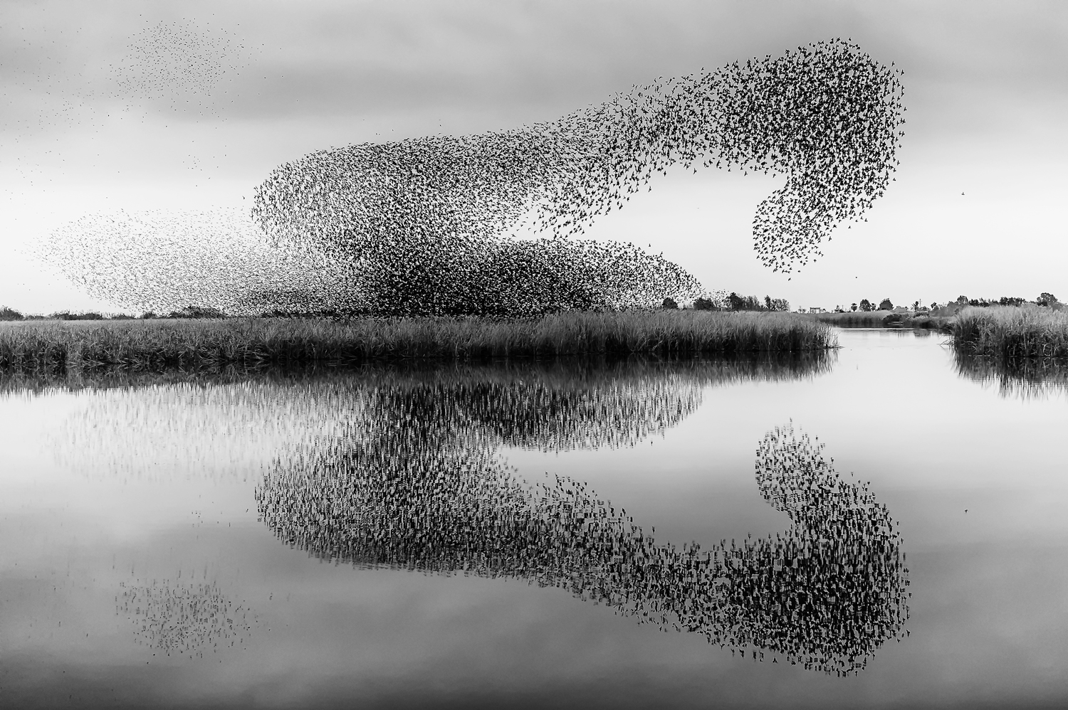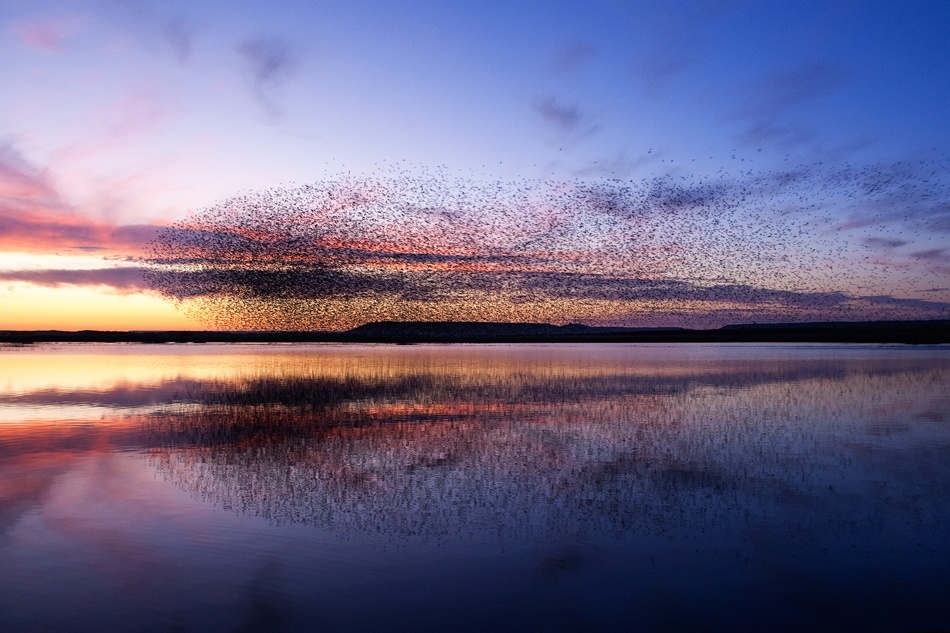 It documents a murmuration of starlings and is a one in a million shot. An instant taken with everything coming together at the same time to create this mesmerizing and stunning image. The still water and the birds flocking in unison and with camera in hand, the photographer captured a perfectly timed and executed image. Sublime.
