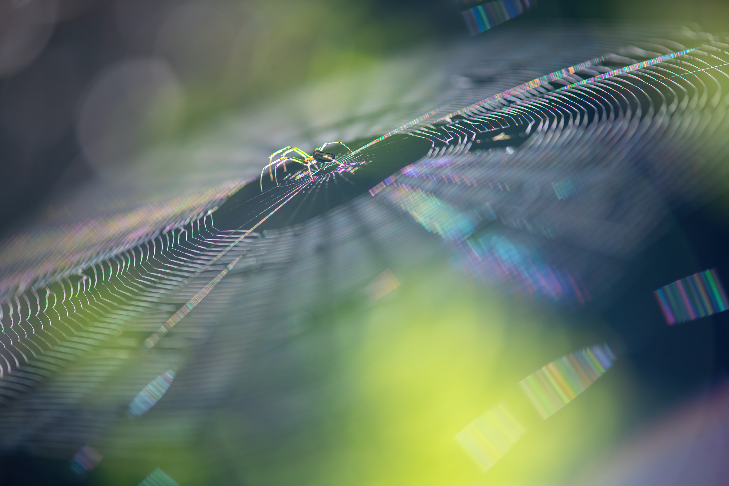 Today's image is of one such harmless little creature (shudder) sitting at the centre of his death web waiting to pounce and suck the life out of an insect. The photographer has managed to make this creepy little creature almost beautiful. It's translucent body suffused with iridescent colours and it's web displaying diffracted rainbows of light. The way spider webs cause this effect is a whole subject in itself. Basically a combination of sticky droplets on fine threads diffracting, refracting and interfering lightwaves into forming a colourful display. Pretty, yet deadly. You can find that particular rabbit hole here.