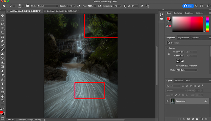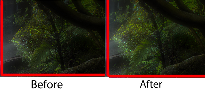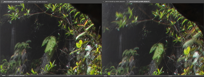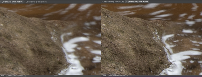 Comparison with the local area (waterflow) after 100% enlargement. On the right side, two major changes were made: (1) colour was slightly adjusted towards a cooler tone; (2) through light painting, further increasing the contrast and textures of the waterflow appearance.