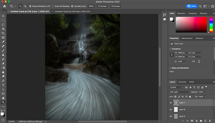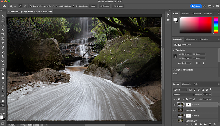 It should be noted that the image obtained from Step 2 (see p10) only achieves the long exposure effect, the foreground and background may not be properly focused. So in this step, I need to combine the sharp image produced from Step 1 with the long exposure image produced from Step 2.