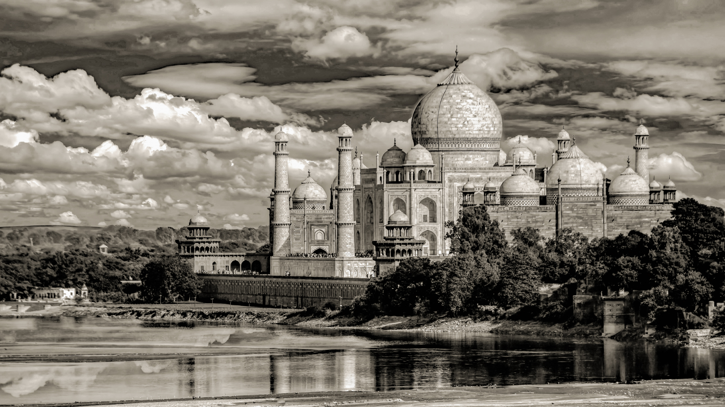 Taj Mahal is a white ivory marble mausoleum located on the right bank of the Yamuna River in Agra, Uttar Pradesh, India.