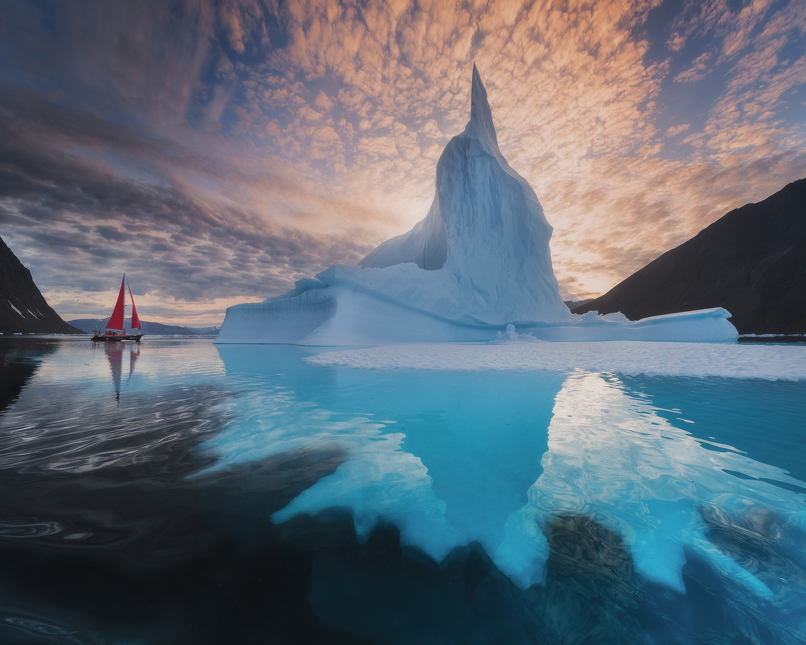 Signature motif: The red sail appears in dozens of compositions, framed against glaciers, backlit at dawn and trailing colourful reflections in the calm waters of fjords.